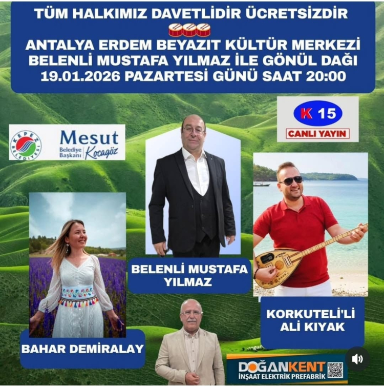 Belenli Mustafa’nın hazırlayıp sunduğu “Gönül Dağı” programının bu haftaki konukları Bahar Demiralay ve Korkutelili Ali Kıyak olacak. Belenli Mustafa ve konukları sevilen türküleri, canlı yayında sizler için seslendirecek. Antalya Erdem Bayazıt Kültür Merkezi’nden Pazartesi günü akşam saat 20.00’de yayınlanacak olan “Belenli Mustafa ile Gönül Dağı” programını sakın kaçırmayın. Ayrıca program halka açık ve ücretsiz.
