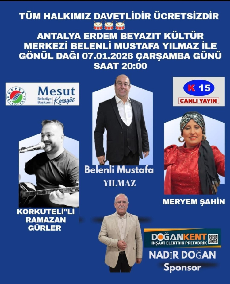 Belenli Mustafa’nın hazırlayıp sunduğu “Gönül Dağı” programının bu haftaki konukları Meryem Şahin ve Korkutelili Ramazan Gürler olacak. Belenli Mustafa ve konukları sevilen türküleri, canlı yayında sizler için seslendirecek. Antalya Erdem Bayazıt Kültür Merkezi’nden yarın akşam saat 20.00’de yayınlanacak olan “Belenli Mustafa ile Gönül Dağı” programını sakın kaçırmayın. Ayrıca program halka açık ve ücretsiz.