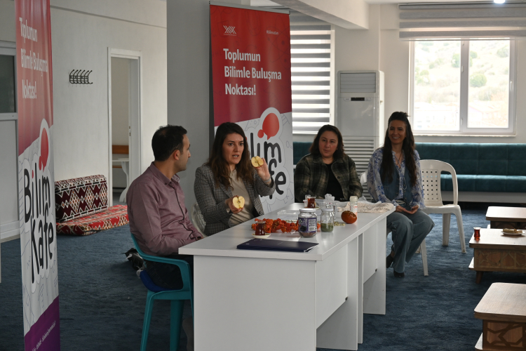 MAKÜ’nün Bilim Kafe etkinliğinde, Öğr. Gör. Dr. Damla Bayana Sönmez geleneksel gıda kurutma yöntemlerinin bilimsel temellerini anlattı; Büğdüzlü kadınlar hem öğrendi hem deneyimlerini paylaşarak üretimlerini katma değere dönüştürmenin yollarını keşfetti.