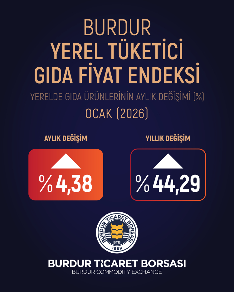 Burdur Ticaret Borsası tarafından hazırlanan Yerel Tüketici Gıda Fiyat Endeksi’ne göre, Ocak ayında gıda artışı bir önceki aya kıyasla %4,38 olarak hesaplandı.