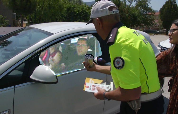“Kurban Bayramı Tedbirleri” kapsamında denetimlerini sürdüren ekipler, şehirlerarası seyahat eden sürücülere, uyarı içerikli broşür dağıtarak, şeker ikram etti.