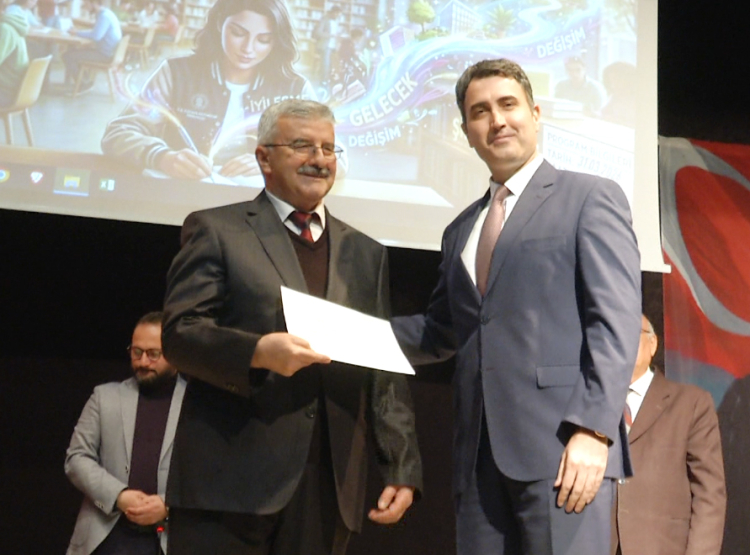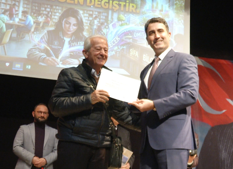 “En Yaşlı Üye Osman Akay, En Küçük Üye Mustafa Eymen Özdemir ve 2025 yılında en fazla kitap ödünç alan ilk üç okuyucuya hediyeleri, protokol üyeleri tarafından verildi.
