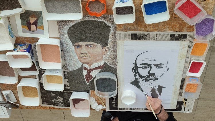 Farklı renk ve dokulardaki mermer tozlarını çizdiği resimlerin üzerine uygulayan Uyar, renklendirme yapmadan taşın doğal tonlarıyla özgün portre ve kompozisyonlar tasarlıyor.