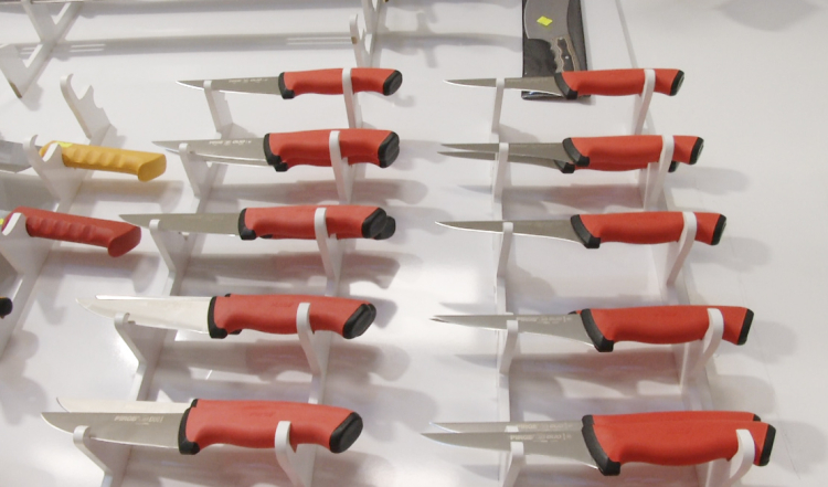1-2 numara gibi bıçaklarımız var, kasap bıçağı dediğimiz özel bıçaklar var evde kullanılan bıçakların haricinde bunları kullanmalarını tercih ettiriyoruz biz burada. Sadece bunlar da değil doğrama bıçakları, yüzme ve sıyırma bıçakları var. Bu tabii kesimden sonraki özel işlemler. Hem set olan ürünlerimiz var setlerde genelde 5 tane bıçak vardır içerisinde 3 ile 5 arasında değişiyor. 3’lü olan bıçaklar 700-800 TL’den başlıyor, 5’li olan gruplar da bin liradan başlıyor.
