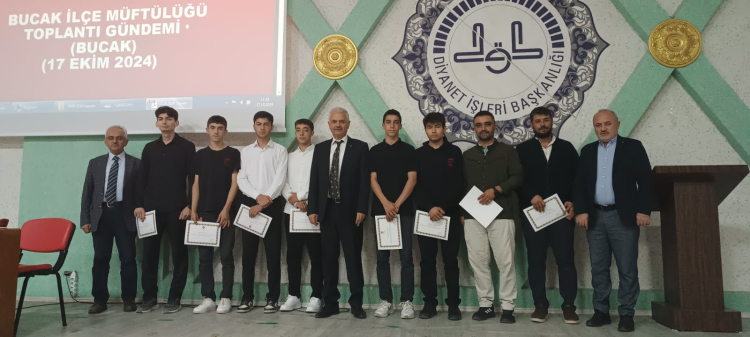 Bucak Müftülüğüne gönderilen belgeler, Bucak İlçe Müftüsü İbrahim Keser tarafından hatimle teravih namazı kıldıran hafızlara takdim edildi.
