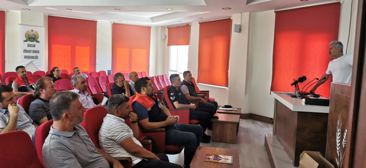 Bucak Ziraat Odası toplantı salonunda gerçekleştirilen bilgilendirme toplantısına Bucak İlçe Tarım ve Orman Müdürü İrfan Samur, köy ve mahalle muhtarları katıldı.