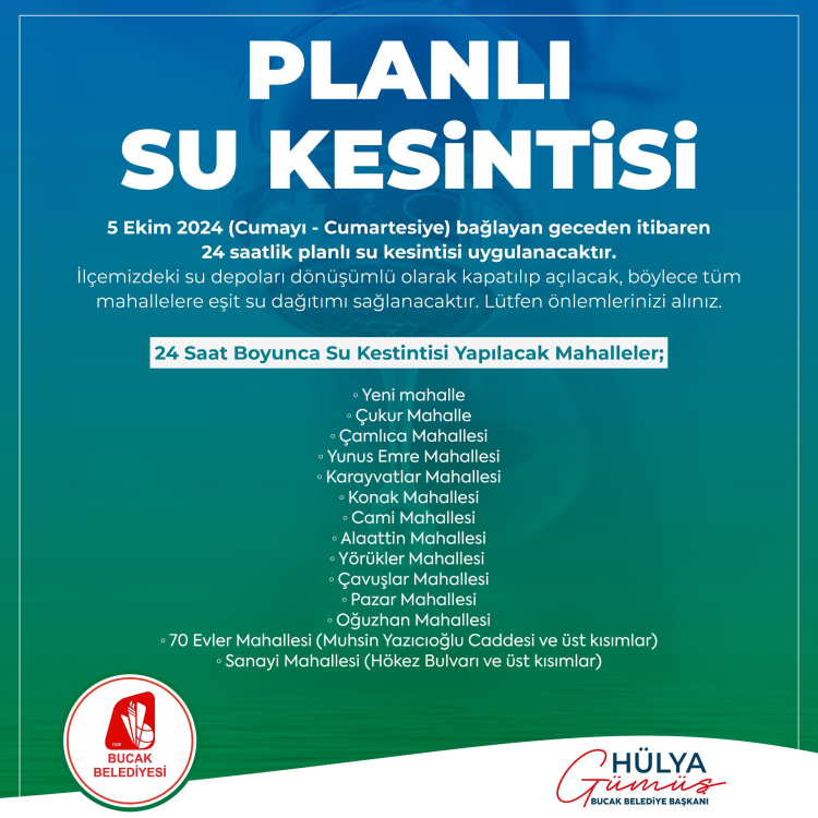 Burdur'un Bucak ilçesinde 6 Ekim 2024 pazar günü planlı su kesintisi yapılacak. Su kesintisi 24 saat sürecek