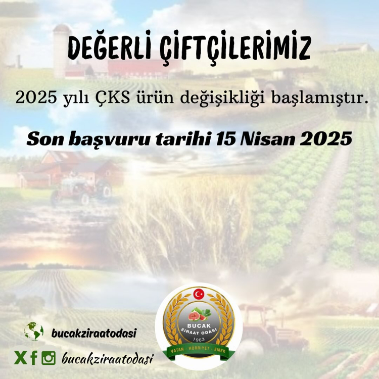 Bucak Ziraat Odası tarafından yapılan açıklamaya göre üreticiler 2025 yılı çiftçi Kayıt Sistemi beyanlarındaki ürünlerde değişiklik yapmak için 15 Mart/15 Nisan tarihleri arasında İl/İlçe Tarım ve Orman Müdürlüklerine başvurabilecek. Konuyla ilgili olarak Bucak Ziraat Odası tarafından yapılan açıklamada; “Üreticilerimiz 2025 yılı çiftçi Kayıt Sistemi beyanlarındaki ürünlerde değişiklik yapmak için 15 Mart/15 Nisan tarihleri arasında İl/İlçe Tarım ve Orman Müdürlüklerimize başvurabilir veya E-Devlet sistemi üzerinden ürün değişikliklerini yapabilirler” denildi.