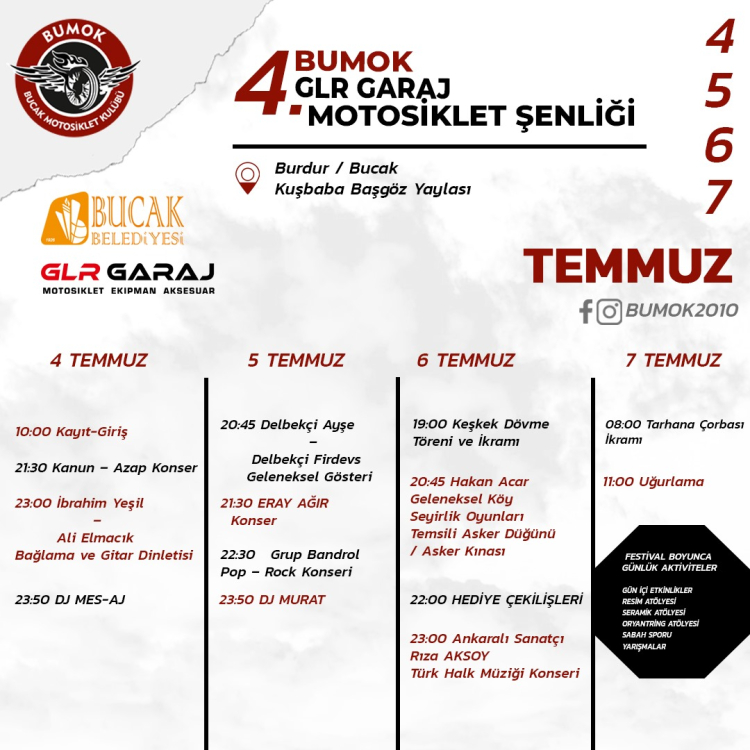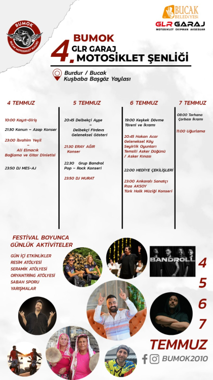 Bucak Motosiklet Kulübü tarafından bu yıl 4. düzenlenecek olan Motosiklet Şenliği, ilçeye bağlı Kuşbaba Köyü Başgöz Yaylası’nda yapılacak. Türkiye’nin dört bir yanından Motosiklet Kulübü Üyelerinin katılım sağlayacağı 4. Motosiklet Şenliği 4-5-6-7 Temmuz tarihlerinde gerçekleştirilecek. 4 gün sürecek olan şenliğin medya sponsorluğunu geçen yıl olduğu gibi bu yıl da Kanal 15 Televizyonu üstlendi. Motosiklet Şenliği’nin ilk günü 4 Temmuz Perşembe günü saat 21.30’da Kanun Azap, 23.00’de İbrahim Yeşil ve Ali Elmacık, 23.50’de DJ MESAJ, 5 Temmuz Cuma günü saat 20.45’de Delbekçi Ayşe&Delbekçi Firdevs, 21.30’da Eray Ağır, 22.30’da Grup Bandrol, 23.50’de DJ Murat, 6 Temmuz Cumartesi günü ise saat 23.00’de Ankaralı Sanatçı Rıza Aksoy sahne alacak.