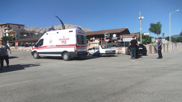 Edinilen bilgilere göre bugün saat 16.30 sularında Burdur Ağlasun Hamam Mahallesi Kantar Yeri Kavşağı mevkiinde kontrolsüz kavşakta 07 ZK 756 plakalı otomobil ile 35 CJU 734 plakalı otomobil çarpıştı.