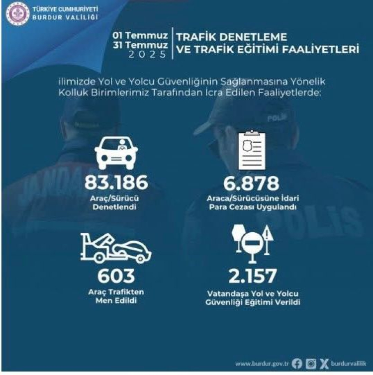 Valilikten yapılan açıklamada, “İlimizde kolluk bilimleri tarafından 1-31 Temmuz tarihleri arasında trafik denetleme ve trafik eğitimi faaliyeti icra edilmiştir. Yapılan denetimlerde, 83.186 araç ve sürücüsü denetlenmiş, 6.878 araç sürücüsüne idari para cezası uygulanmış, 603 araç trafikten men edilmiş, 2.157 vatandaşa yol ve yolcu güvenliği eğitimi verilmiştir. Kamuoyuna saygıyla duyurulur” denildi.