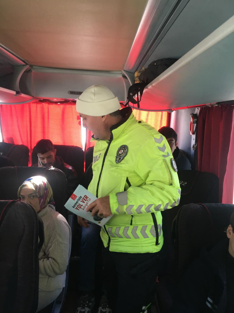 Trafikte can ve mal kayıplarının önüne geçilmesi, sürücü ve yaya güvenliğinin sağlanması amacı ile Burdur Şehirlerarası Otobüs Terminalinde ve Armağan İlci Bulvarı üzerinde yapılan eğitim, bilgilendirme ve bilinçlendirme faaliyetleri kapsamında 19’u otobüs olmak üzere toplam (376) araç ve sürücüsü denetlenmiş, yapılan denetimlerde; sürücü, yolcu ve yayalardan oluşan toplam (1.106) vatandaşımıza emniyet kemeri kullanımı, seyir halinde cep telefonu kullanımı, kış lastiği kullanımı ile motosiklet sürücülerine yönelik kask ve koruyucu ekipman kullanımı konularında eğitim ve bilinçlendirme faaliyetleri yapılarak bilgilendirme broşürleri dağıtılmıştır. Kamuoyuna saygıyla duyurulur” denildi.