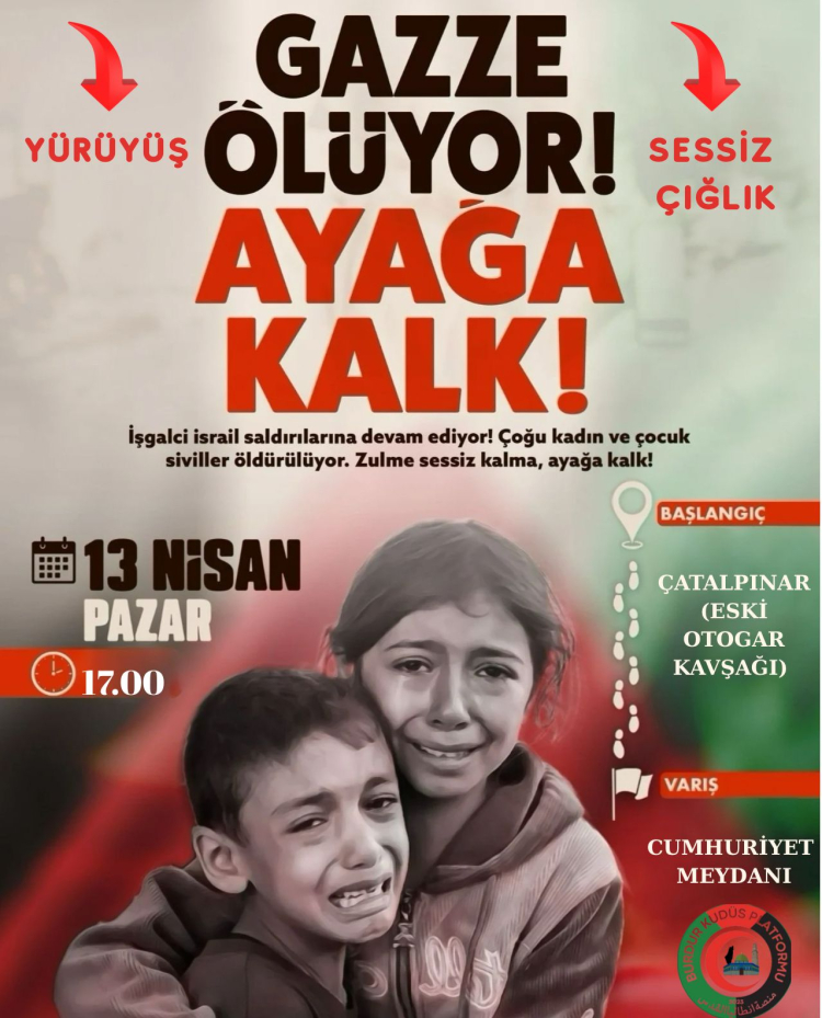 "Gazze Ölüyor, Ayağa Kalk” çağrısına kulak veren kalabalık, Çatalpınar (Eski Otogar Kavşağı) Meydanı'ndan Cumhuriyet Meydanı'na yürüyüş gerçekleştirdi.