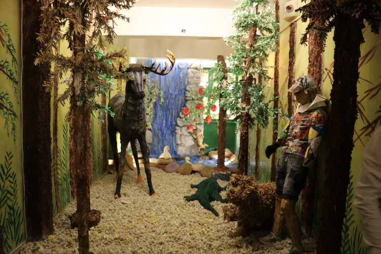 Resim Öğretmeni Özlem Dolunay öncülüğünde oluşturulan koridorda, karton kağıtlar, deterjan kutuları, atık plastikler, çöp poşeti, kumaş ve sünger parçaları gibi geri dönüştürülebilir malzemelerle yapılan geyik, köpek, kertenkele, ağaç, insan figürleri, sokak lambaları gibi tasarımlar sergilendi.