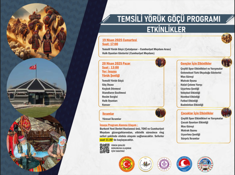 19 Nisan Cumartesi günü saat 17.00’de Çatalpınar-Cumhuriyet Meydanı arasında “Yörük Göçü” gerçekleştirilecek. Yörük Göçünün ardından Cumhuriyet Meydanında halk oyunları gösterisi sunulacak. “Temsili Yörük Göçü” kapsamındaki etkinlikler, 20 Nisan Pazar günü saat 13.00’de İnsuyu Mağarası girişinde devam edecek. İnsuyu Mağarası girişindeki etkinlikler, Kanal 15 ekranlarından da canlı yayınlanacak.