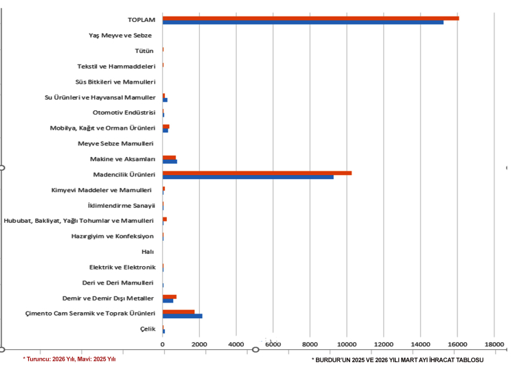 BUTSO Başkanı Yusuf KEYİK, 2026 yılı mart ayı için Burdur’un ihracatta en hareketli sektörleri ve son bir yıllık değişimi içeren tabloyu paylaştı: