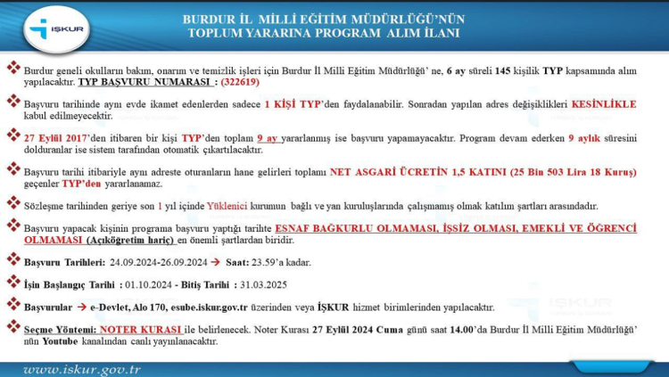 Konuyla ilgili olarak Burdur İl Milli Eğitim Müdürlüğü tarafından yapılan duyuruda; “Burdur İl Millî Eğitim Müdürlüğümüze bağlı okullarımızın temizlik, çevre düzenlemesi ve bakım onarım hizmetlerini gerçekleştirmek üzere, 6 ay süreli 145 kişilik Toplum Yararına Program (TYP) alım ilanı yayımlanmıştır” denildi.