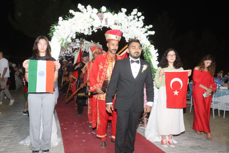 Düğün alanına mehter takımıyla giriş yapan gelin ve damat, daha sonra geleneksel Hint danslarını sergiledi. Hindistan'tan geleneksel kıyafetleriyle gelen damadın akrabaları da gelinin akrabalarıyla karşılıklı oynadı.