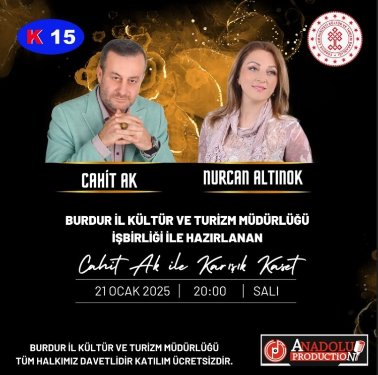 Cahit Ak ve konuğu Nurcan Altınok, sevilen türküleri canlı yayında sizler için seslendirecek. Burdur Valiliği İl Kültür ve Turizm Müdürlüğü işbirliğinde yarın akşam saat 20.00’de Burdur Kültür Merkezi’nden yayınlanacak olan “Cahit Ak ile Karışık Kaset” programını sakın kaçırmayın. Ayrıca program halka açık ve ücretsiz.