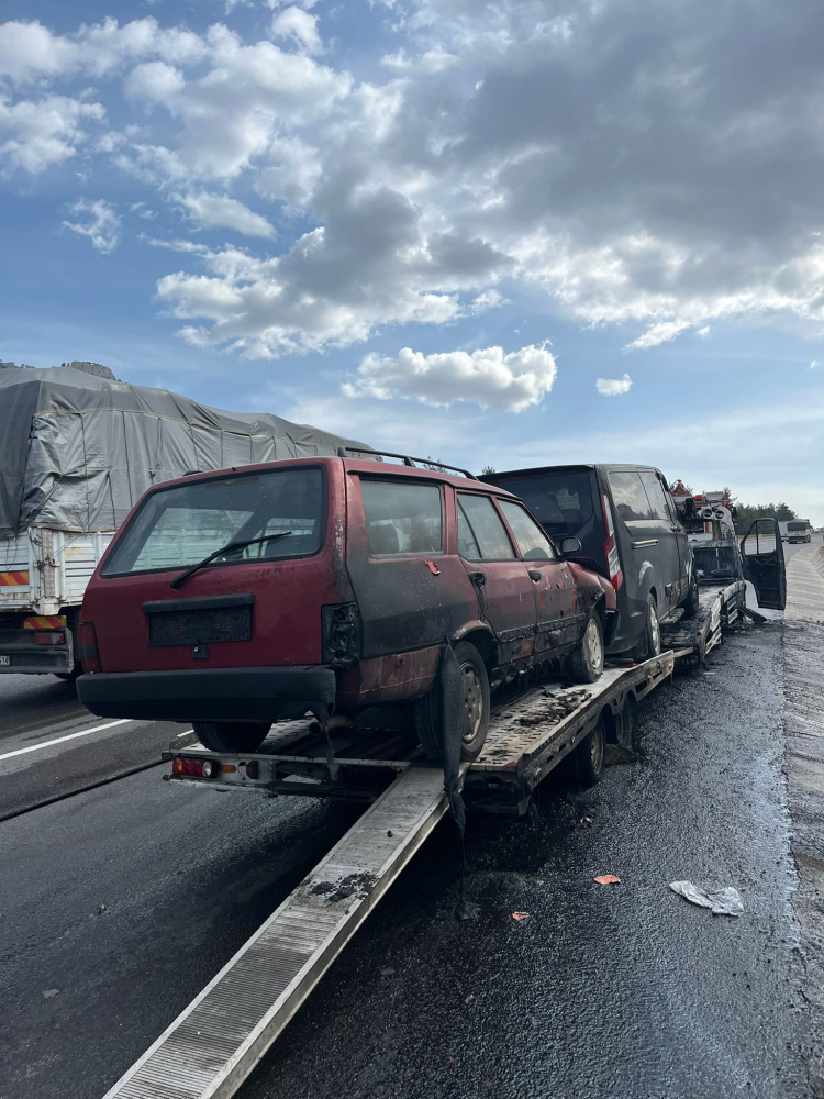 Sürücünün yol kenarına çektiği araçtaki yangın, üzerinde yüklü otomobil ve hafif ticari araca da sıçradı.