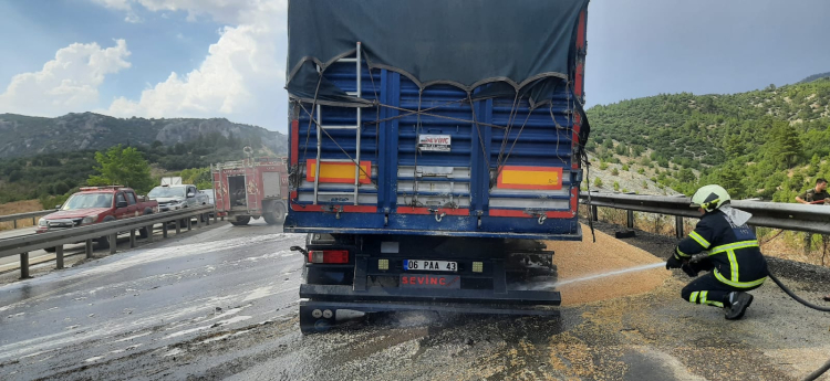 Antalya-Burdur Karayolu Çeltikçi Tekke köyü rampasında buğday yüklü tır yangını meydana geldi.