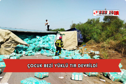 Mersin'in Tarsus ilçesinde çocuk bezi yüklü tır devrildi.