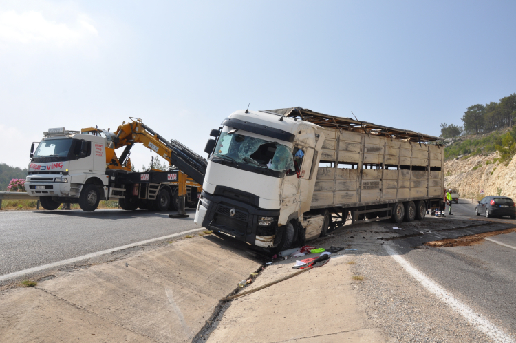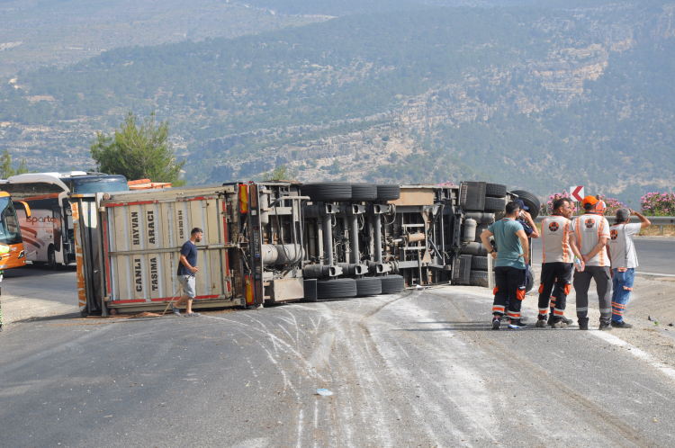 Mehmet Salih Ulukale idaresindeki 60 angus türü büyükbaşın yüklü olduğu 07 BBY 407 plakalı tır, Çamdüzü mevkisinde, sürücüsünün direksiyon hakimiyetini kaybetmesi sonucu devrildi.