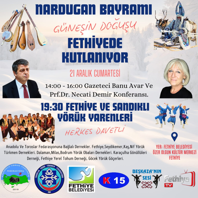 21 Aralık Cumartesi günü Fethiye Belediyesi Özer Olgun Kültür Merkezi’nde saat 14.00 ve 16.00’da Gazeteci Banu Avar ve Prof. Dr. Necati Demir konferans verecek.