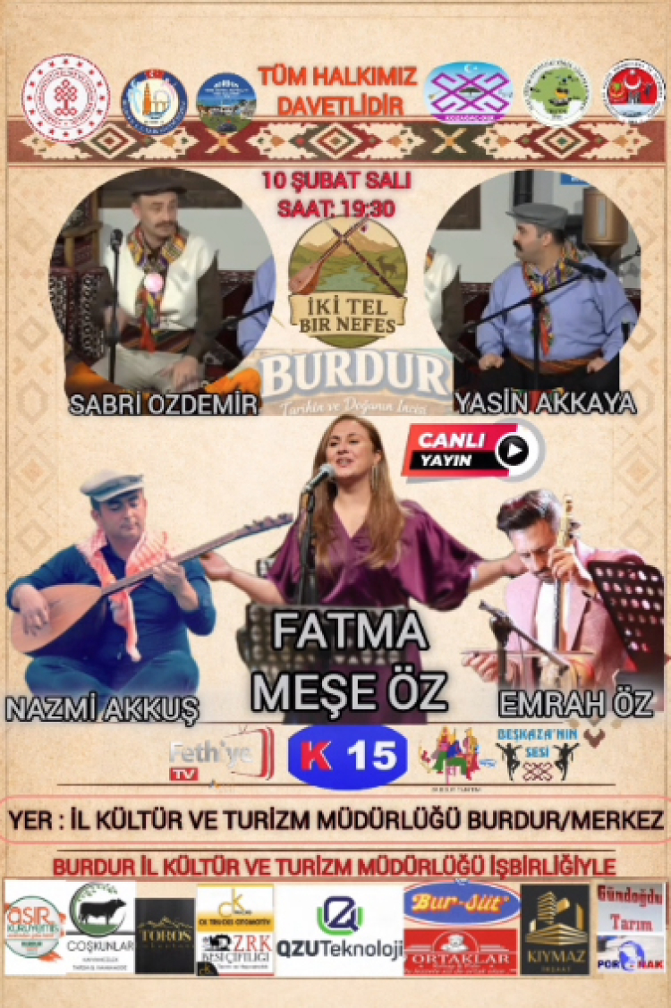 Sürpriz konukların da yer alacağı programda, kültür, tarih, turizm, giyim, gelenek ve görenek ele alınacak olup, türkülerin yanında ağzınızı tatlandıracak çeşitli ikramlar da sizleri bekliyor. Kültür ve Turizm Burdur İl Müdürlüğü’nün işbirliğiyle hazırlanan “İki Tel Bir Nefes” programının özel bölümü, Burdur Kültür Merkezi’nden yayınlanacak. Kanal 15’in yanı sıra, sosyal medya platformu Burdur Tanıtım, Beşkaza’nın Sesi ve Fethiye TV’den de izleyicilere aktarılacak olan program, halka açık olarak gerçekleştirilecek.