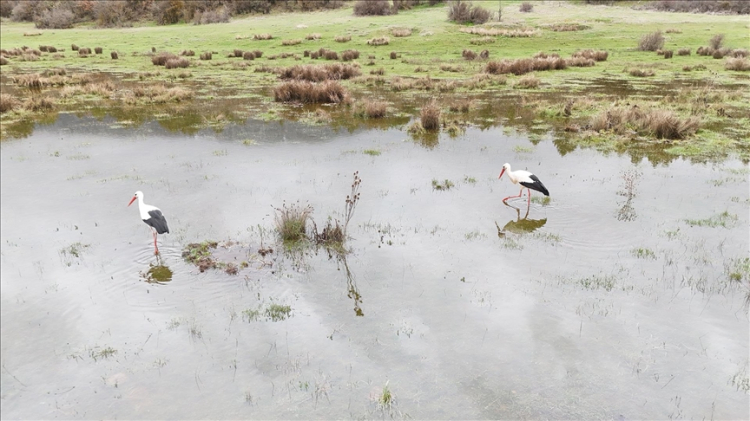 Leyleklerin sulak alanda dolaşmaları ve yiyecek aramaları dronla görüntülendi.