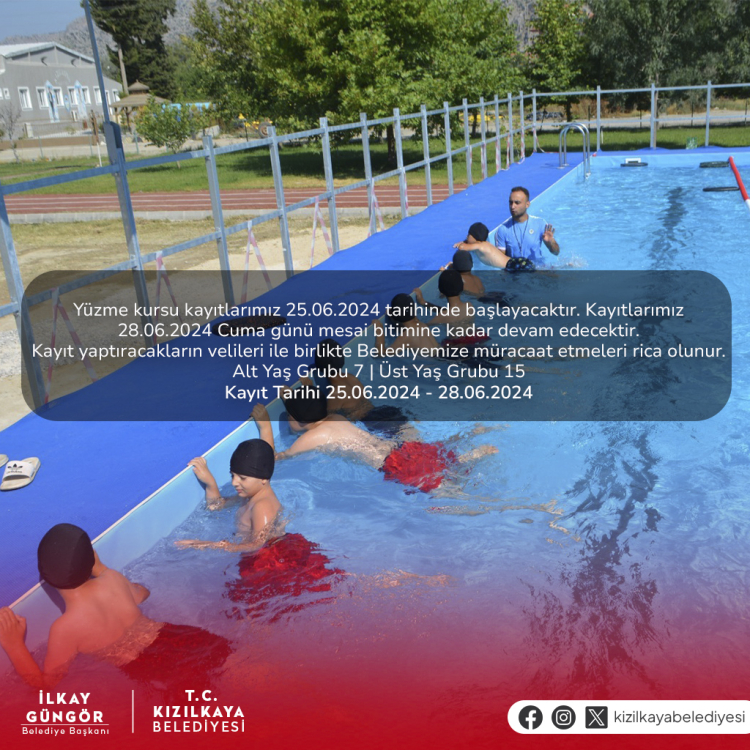Konuyla ilgili olarak Kızılkaya Belediyesi tarafından sosyal medya üzerinden yapılan paylaşımda, “Yüzme kursu kayıtlarımız 25.06.2024 tarihinde başlayacaktır.