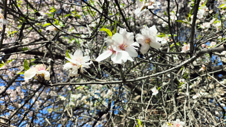Yerli ve yabancı turistler ile bölge halkı erken çiçek açan badem ağaçları önünde fotoğraf çekti.
