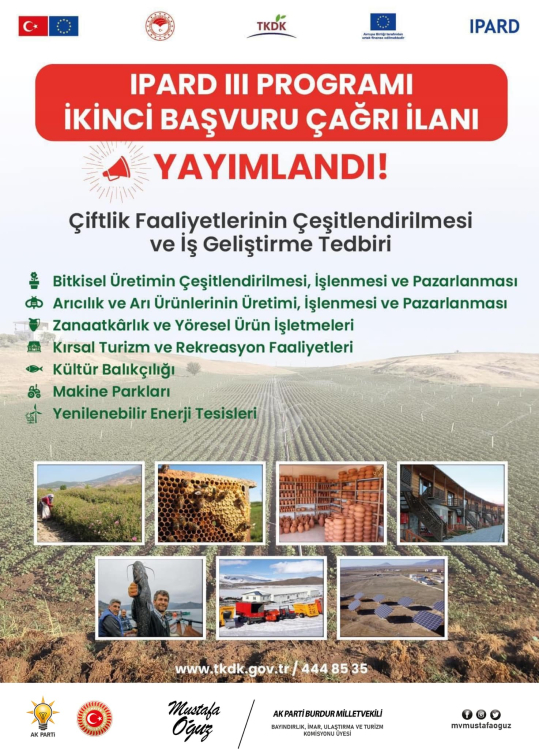 AK Parti Burdur Milletvekili Mustafa Oğuz sosyal medya üzerinden yaptığı paylaşımda IPARD III programı ikinci Çağrı ilanının yayınlandığını belirterek, bu kapsamda 81 ildeki girişimcilere toplam 80 milyon euro hibe desteği sağlanacağını duyurdu.