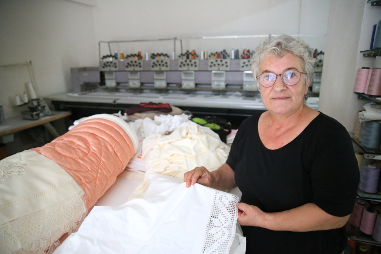 Eski nakış motiflerini bugünün teknolojisi ile başka sektörler için tekstil ürünlerine, peçete, havlu ve bornozlara da işleyen Demir, evinin geçimini sağlarken hayat mücadelesiyle örnek oldu.