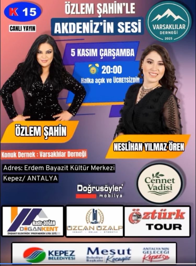 Kanal 15 ekranlarında 15 günde bir Çarşamba akşamları yayınlanan “Özlem Şahin ile Akdeniz’in Sesi” programı, bugün akşam canlı yayınla sizlerle olacak.