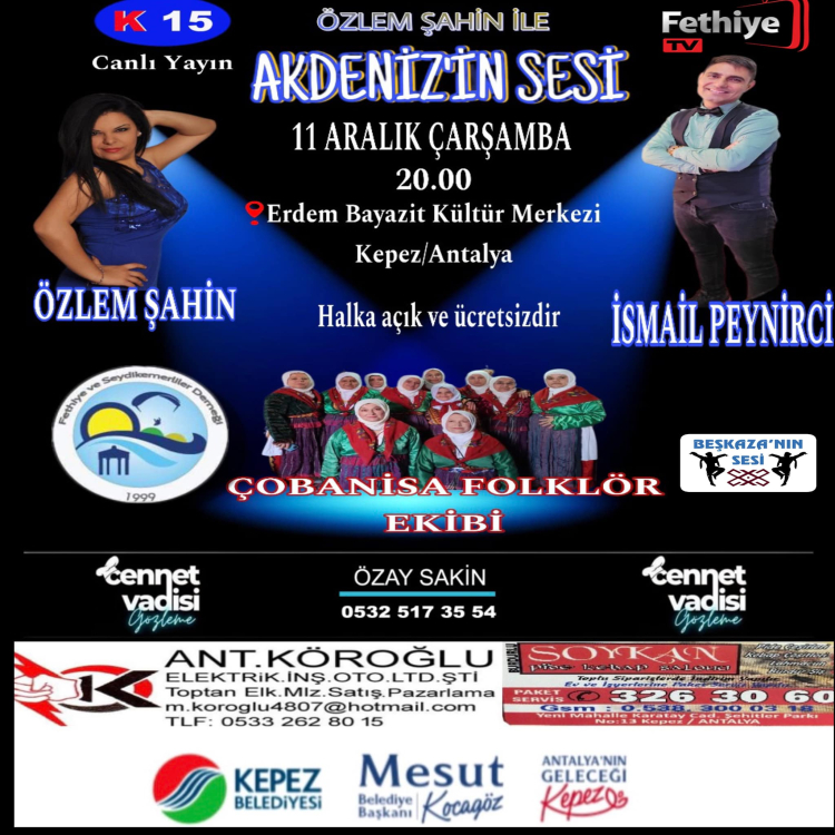 Kanal 15 ekranlarında 15 günde bir Çarşamba akşamları yayınlanan “Özlem Şahin ile Akdeniz’in Sesi” programı bugün akşam canlı yayınla sizlerle olacak.