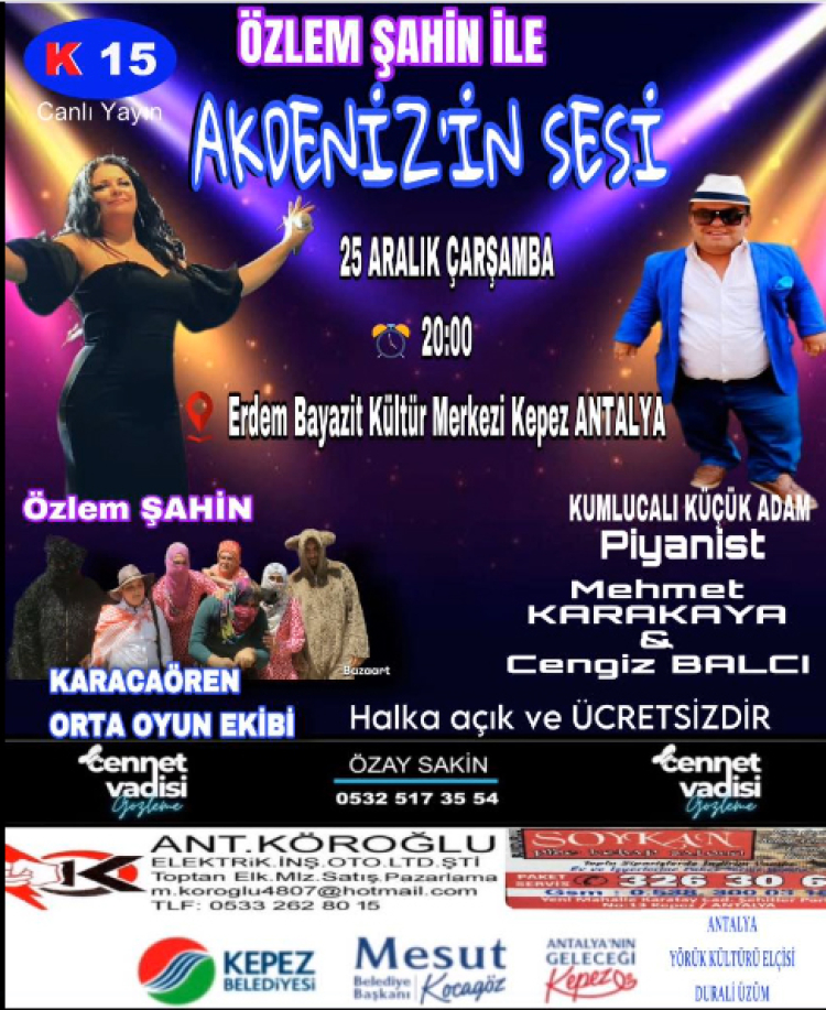 Özlem Şahin’in hazırlayıp sunduğu “Akdeniz’in Sesi” programının bu haftaki konukları Müzisyen Kumlucalı Küçük Adam Mehmet Karakaya ve Cengiz Balcı olacak. Özlem Şahin ve konukları sevilen türküleri, canlı yayında sizler için seslendirecek. Antalya Erdem Bayazıt Kültür Merkezi’nden bugün akşam saat 20.00’de yayınlanacak olan “Özlem Şahin ile Akdeniz’in Sesi” programını sakın kaçırmayın.