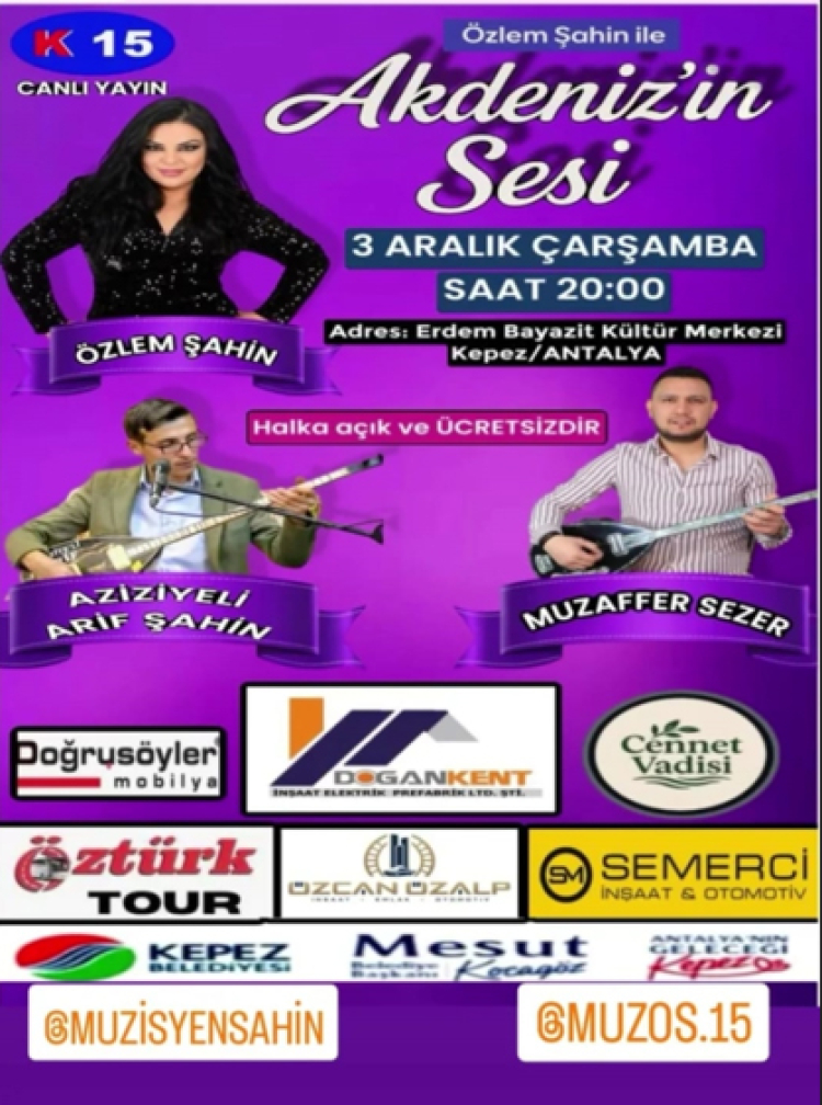 Kanal 15 ekranlarında 15 günde bir Çarşamba akşamları yayınlanan “Özlem Şahin ile Akdeniz’in Sesi” programı, bugün akşam canlı yayınla sizlerle olacak.