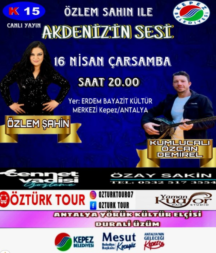 Kanal 15 ekranlarında 15 günde bir Çarşamba akşamları yayınlanan “Özlem Şahin ile Akdeniz’in Sesi” programı 16 Nisan Çarşamba akşamı canlı yayınla sizlerle olacak.