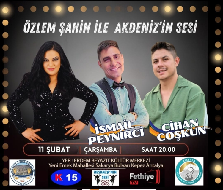 Özlem Şahin’in hazırlayıp sunduğu “Akdeniz’in Sesi” programının bu haftaki konukları Cihan Coşkun ve İsmail Peynirci olacak. Özlem Şahin ve konukları sevilen türküleri, canlı yayında sizler için seslendirecek. Antalya Erdem Bayazıt Kültür Merkezi’nden yarın akşam saat 20.00’de yayınlanacak olan “Özlem Şahin ile Akdeniz’in Sesi” programını sakın kaçırmayın. Ayrıca program halka açık ve ücretsiz.