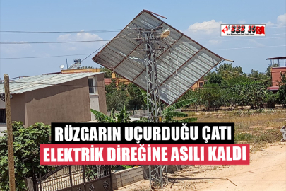 Adana'da Rüzgarın Uçurduğu Çatı Elektrik Direğine Asılı Kaldı