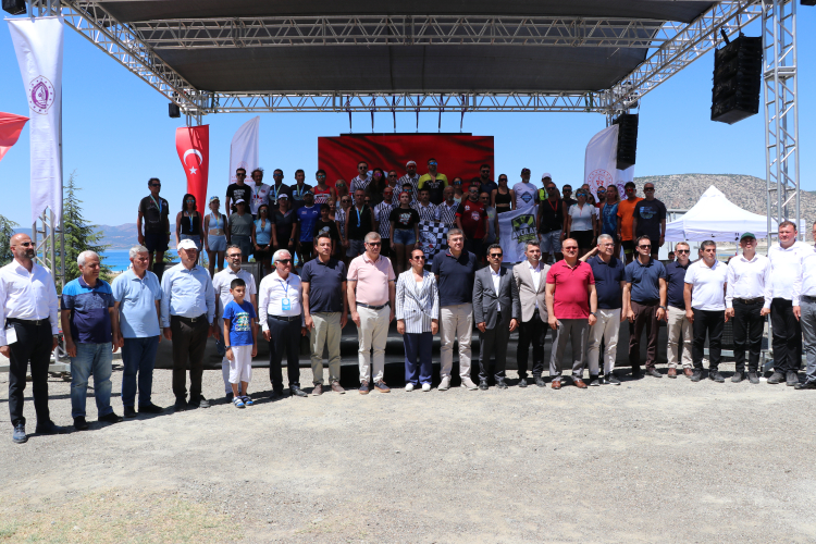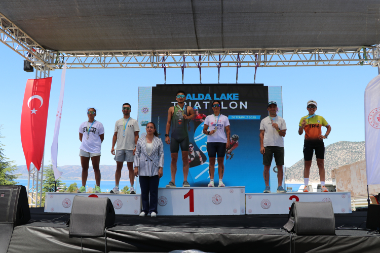 Burdur'un Yeşilova ilçesinde bulunan Salda Gölü'nde 344 sporcunun katılımıyla triatlon yarışması düzenlendi.