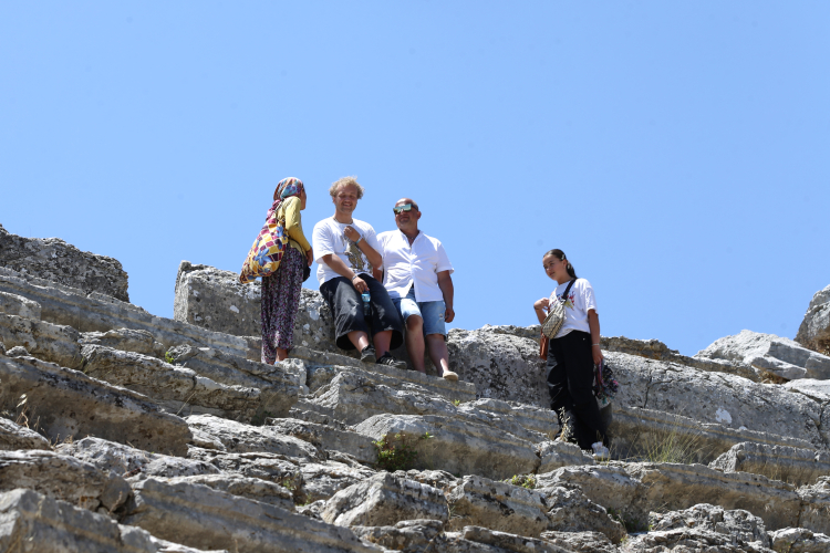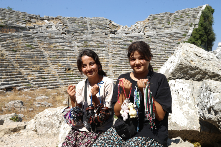 Antik kentte yaz tatillerinde harçlık biriktirmek için el işi örmeleri sattığını aktaran lise öğrencisi Sümeyye Nergis ise "Gelen turistlere İngilizce, Rusça, Almanca bildiğimiz kadar anlatıp, sattığımız ürünlerden okul harçlığımızı çıkarıyoruz." diye konuştu.