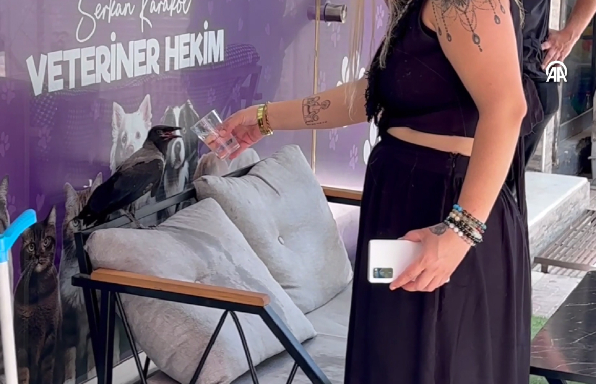 Şahin, burada kargaya su bardağından su içirdi. Karga, üzerine dökülen suyla da serinledi. Bu arada karganın su içmesi cep telefonu kamerasıyla kaydedildi.