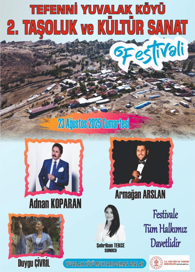 Burdur’un Tefenni ilçesine bağlı Yuvalak Köyü’nde 2.’si gerçekleştirilecek olan “Taşoluk Kültür ve Sanat Festivali” 23 Ağustos Cumartesi günü yapılacak. “Taşoluk Kültür ve Sanat Festivali’nde” Adnan Koparan, Armağan Arslan ve Duygu Çivril Yılmaz sahne alacak. Yuvalak Köyü Muhtarı Osman Atalay “Taşoluk Kültür ve Sanat Festivali’ne tüm halkımız davetlidir” dedi. “Taşoluk Kültür ve Sanat Festivali” 23 Ağustos Cumartesi akşamı Kanal 15 ekranlarından canlı yayınla izleyicilere aktarılacak.