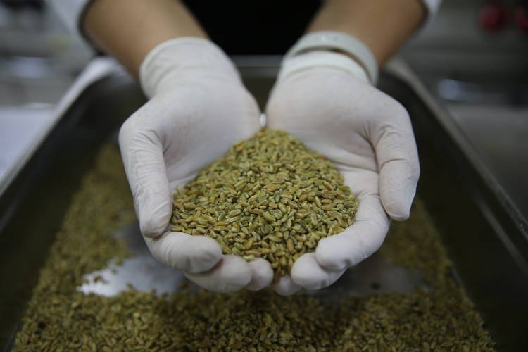 Hafif şekilde yanan ve is kokusuyla farklı bir aromayla makineden çıkarılan başaklar, 2 günlük kurutma işleminin arından sap ve tanelerin ayrılması için öğütülüyor.