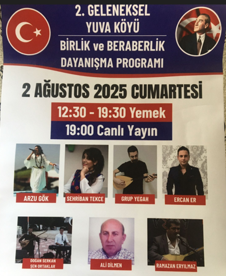 Saat 19.30’da başlayacak olan programda, Arzu Gök, Grup Yegah, Ercan Er, Doğan Çelik, Serkan Şakır, Ali Dilmen ve Ramazan Eryılmaz sahne alacak.“2. Geleneksel Yuva Köyü Birlik ve Beraberlik Dayanışma Programı” yarın akşam saat 19.30’dan itibaren Kanal 15 ekranlarından canlı yayınla izleyicilere aktarılacak.