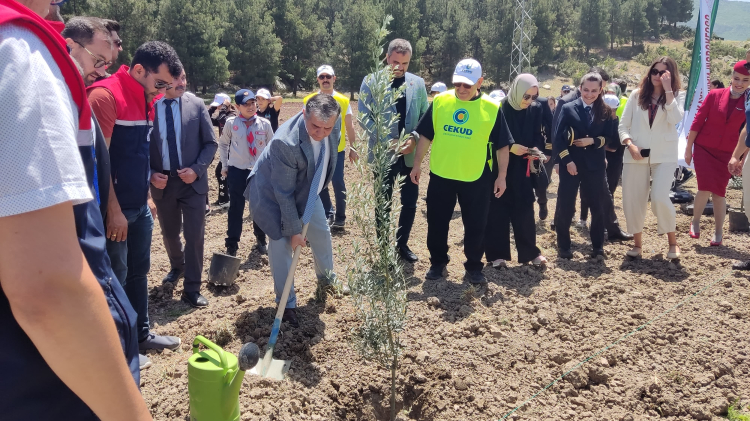 “Dikili Ağacım Var” sloganıyla gerçekleştirilen fidan dikim etkinliğinde, 60 bin adet antep fıstığı ve zeytin fidanı toprakla buluşturuldu.
