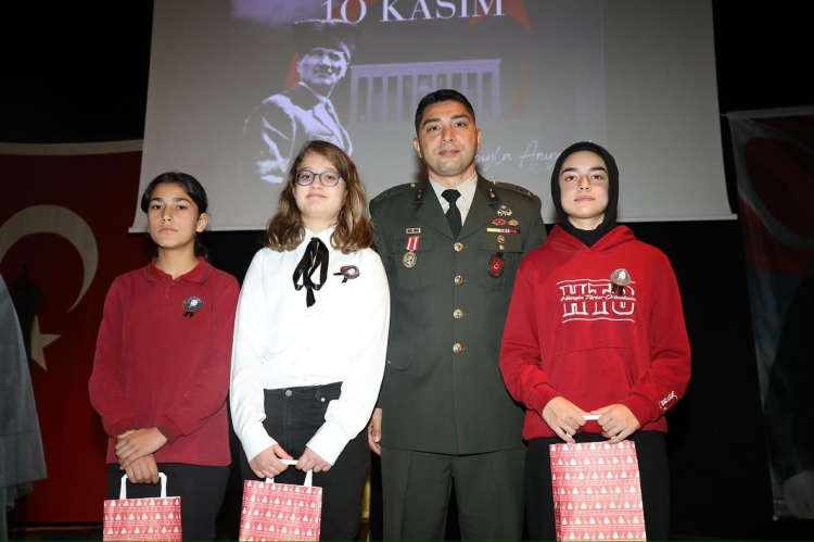 “10 Kasım Atatürk” konulu resim, şiir ve kompozisyon yarışmasında dereceye giren öğrencilere ödülleri, protokol üyeleri tarafından verildi.