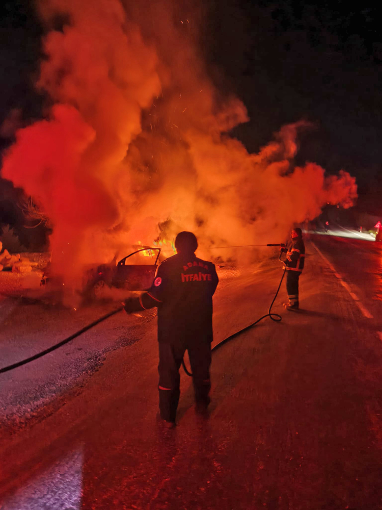 Adana'nın Kozan ilçesinde seyir halindeyken alev alan otomobil, kullanılamaz hale geldi.